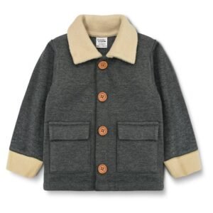 Keep your little one snug and stylish during cooler days with this soft fleece button-down jacket, featuring a timeless dark grey design with cream collar and cuffs. Practical and warm, it’s perfect for layering over outfits for outdoor adventures or casual outings.